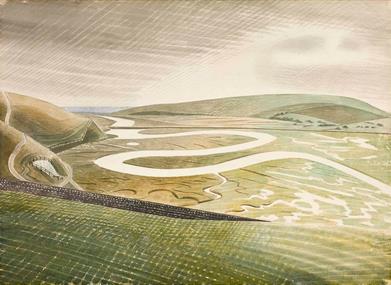 Des aquarelles, des dessins préparatoires, des estampes et des céramiques de Ravilious figurent tous aux côtés d’œuvres de certains de ses amis et pairs les plus proches, dont sa femme Tirzah Garwood et ses amis proches Edward Bawden et Peggy Angus. Ces œuvres sont toutes liées aux thèmes de la collection Towner : le paysage, le lieu et la maison.